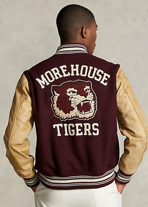 Ralph Lauren is proud to partner with Morehouse, a prestigious historically Black college, to introduce a first-of-its-kind collection. Inspired by the rich heritage and esteemed traditions of Morehouse College, this wool-blend jacket features an “M” letterman patch and chain-stitched “Polo R.L.” embroidery at the front. Complete with leather sleeves and exclusive enameled snaps, it is finished with a tiger graphic based on archival yearbook images of the storied institution’s mascot.