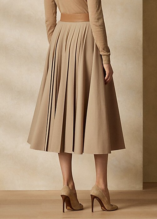 Modernizing a timeless wardrobe staple, the Witley revamps the A-line skirt with a stretch-infused wool flannel fabrication, crisp pleats, and a lambskin waistband, which secures with two “Ralph Lauren”-engraved snaps.