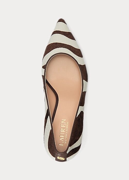 Crafted from bold zebra-print haircalf with sumptuous, burnished leather trim, the pointy-toe Lanette pump features a padded insole for all-day comfort, while a polished metal monogram at the heel provides a signature Lauren finish.
